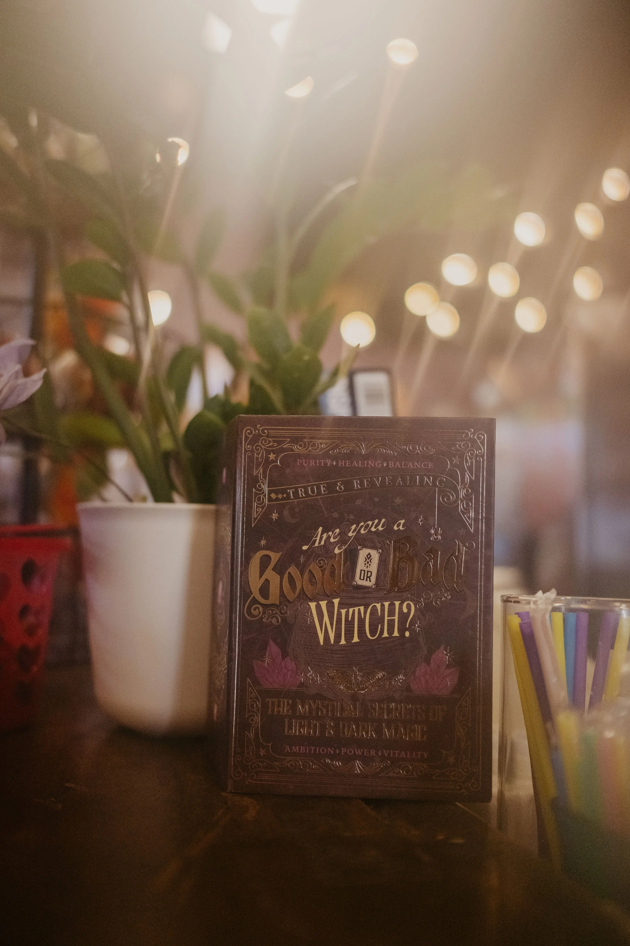 I stayed another hour, walking around with my lens, finding the light in all the right corners — the chalk mural covered in hand-drawn florals, the bold wave-and-sun painting, the witchy "Good or Bad Witch" book propped on the counter, the gaming dice display catching window light.